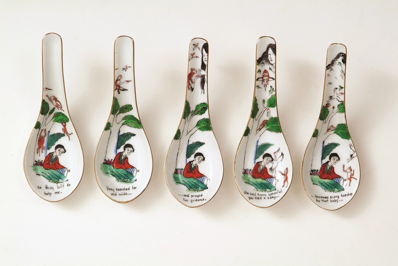 Maiden of the Ba Tree was the first work that saw Chang properly implementing this change. A series of 35 porcelain spoons are laid out, each one acting as a panel on a storyboard. A woman sits on the ground while her son stands beside her and they are sheltered by a leaf above their heads. She begins to tell a tale. The son supposedly leaves her while she sleeps; she awakes, yearning for him. Much time passes by, only for the reader to realise that the son had never left. It was instead the mother who chose to ignore him.