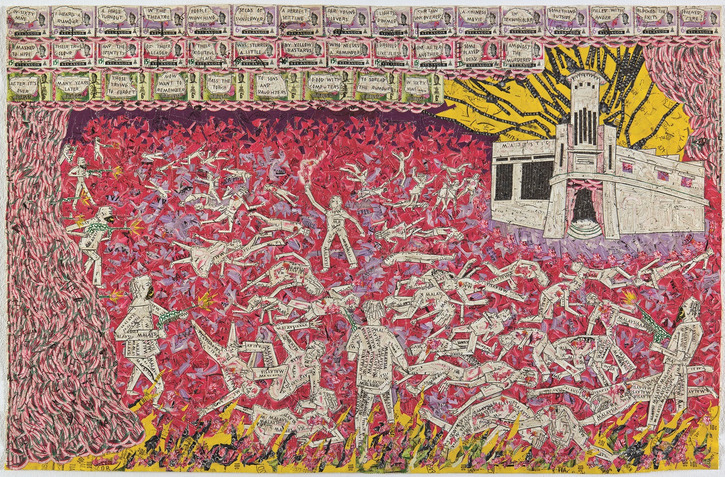 Chang created more stories based on the “evidence”. Don’t Spread Rumours tells the tale of dark times in Malaysia’s past; a chaotic scene, with bodies lying across bloodied streets. Figures on the edges of the work are armed while a lone figure in the centre stands firm wielding a weapon of his own. Racial riots broke out on