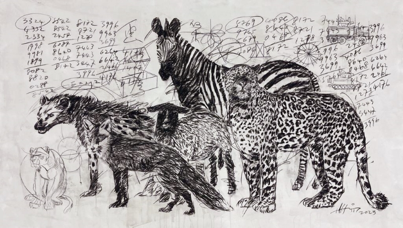 His thoughts swirl from the three disastrous years of Covid and how, barely out of that hard period, there are now wars in Ukraine and Gaza. With detailed charcoal drawings, he captures creatures standing alongside each other in groups, a stark reminder that humans can find balance in the ecosystem, as long as we are sensitive enough to handle what life throws us, “as long as the world does not come to total destruction” with the press of a button.