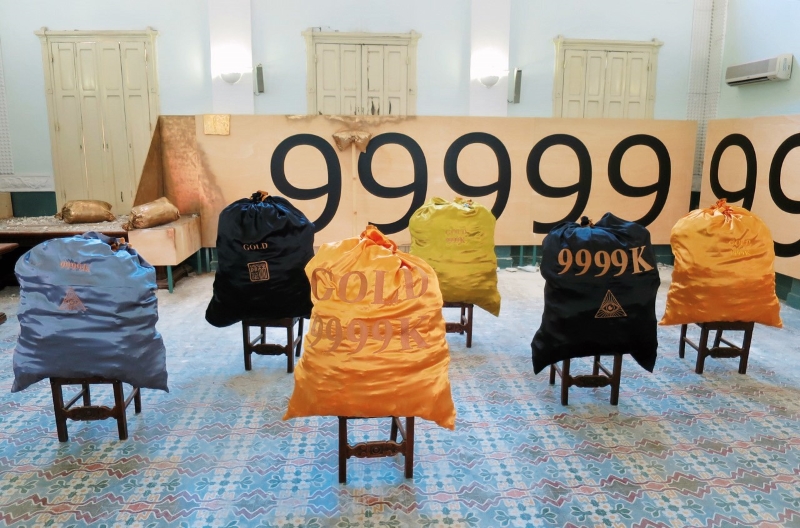 Looking at the money sacks — a recurring motif in Lim’s work — lined up for Gaze, the answer is yes. They reflect man’s relentless chase for wealth and power, as well as the imbalance between opulence and necessity. The 9999K sewn on the cloth sacks denote 100% gold.