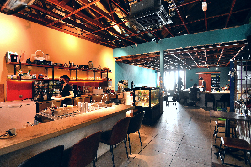 Dissolved Solids has a stripped-back aesthetic, with tiled floors, cement counters, exposed ceiling beams and open wood shelves. It is split into two sections, with a horseshoe-shaped bar — part of the counter is occupied by coffee-making equipment and the curved section is for guests to sit — at its centre. Half of the space feels like a minimalist coffee shop with muted-orange walls and simple seating made cheerful with the rays of sunlight filtering in from the large windows that face the main road. The other part, towards the back of the space, has blue walls, with another U-shaped bar on one side and rattan tables and stools on the other.
