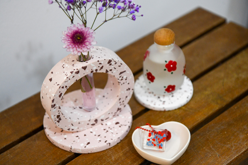 Rather than flooring, Tan’s main focus is to “apply terrazzo designs to different things”. The label offers a variety of colourful trinkets that are the perfect pick-me-up. Shelves in-store are always stocked with trays, display plates, mini vases, keychains and more. One side of the shop is dedicated to collaborations Tan has done with other local artisans: a mini plate to set a diffuser on, stamps with cartoon prints, handmade bar soap with terrazzo patterns and candleholders resembling round beach pebbles.