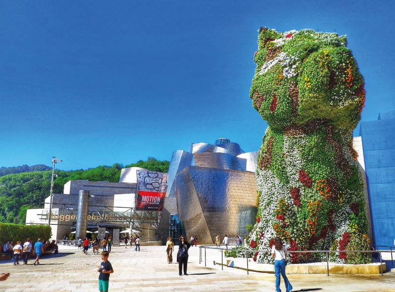 Outside the museum, away from the river, Jeff Koon’s gigantic, flower-power Puppy greets visitors to the museum. The sculpture was the site of an attempted terror attack during the opening of the museum in 1997; members of the Basque separatist group ETA planted grenades, but the intended attack was foiled by a Spanish policeman, who was shot dead.