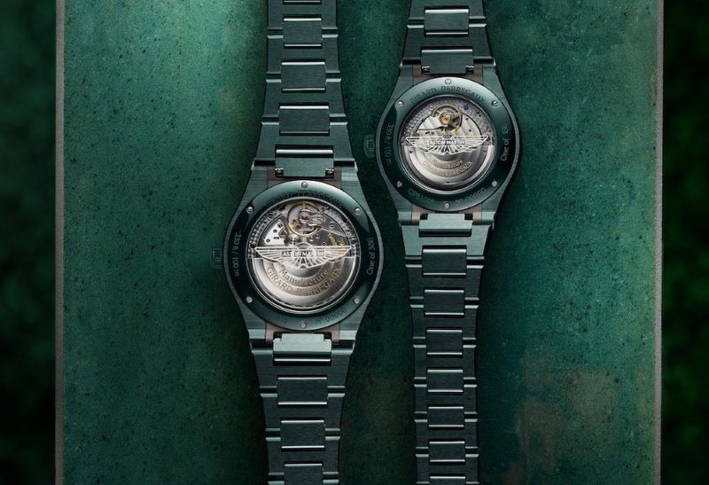 Powered with the in-house Calibre GPO03300, both modern Laureato models are self-winding and can be admired through a see-through caseback, personalised with the Aston Martin logo. Circular graining is featured on the main plate, while other components are endowed with bevelling, mirror-polishing, satin finish, snailing, sunray finish and various engravings.