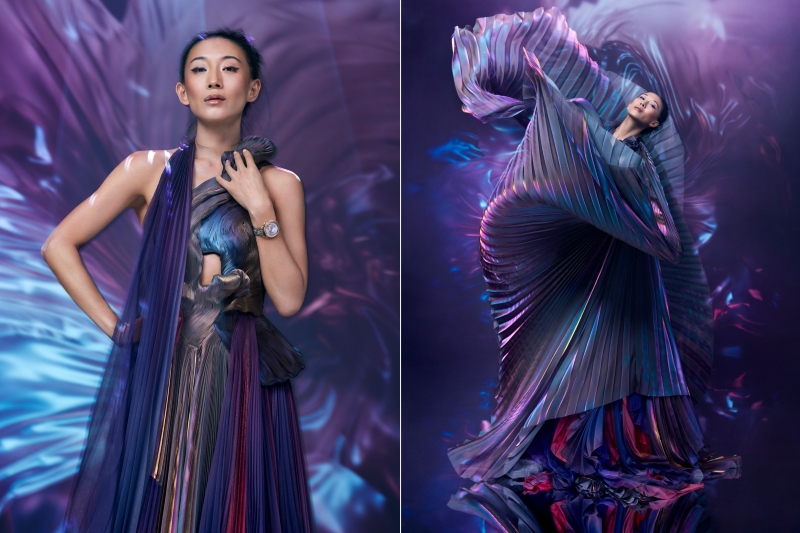 Similarly, Yin designed a haute couture number to accompany the narration of the Égérie concept watch. “I’ve also infused it with nano-dye, which is the process of spraying iridescent particles of metal on a satin surface. They will change colour depending on the angle, light and the way the pleats move,” she explains. On top of that, she designed a 100-piece limited edition lilac Égérie Moon Phase with her name engraved on the caseback. No perfumed straps on this, but there are three interchangeable ones to play with. The watches, fragrance and dress will travel around the world to be exhibited, so fingers crossed Malaysia would eventually be one of its destinations.