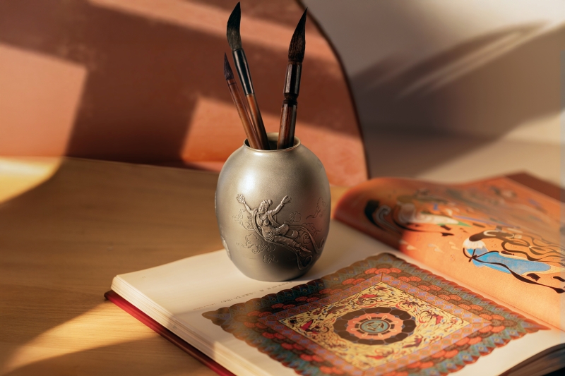 Delicate clouds in fine line art frame the figure of an apsara on the Silk Road Short Vase