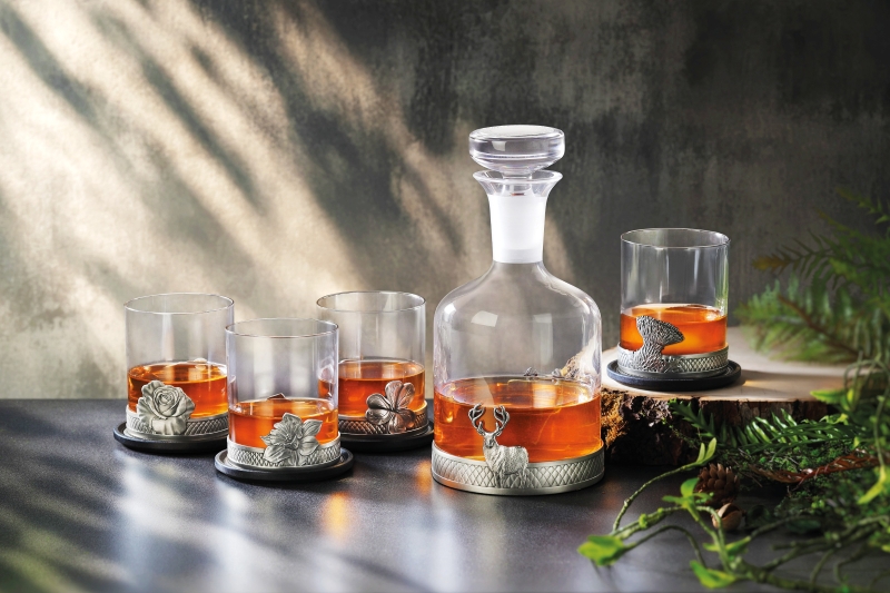 Classic flora and fauna found in the British Isles inform the latest extension, from an elegant stag decanter to a four-piece coaster set engraved with a daffodil, thistle, rose and shamrock. Together with four matching glass tumblers, they make the Woodland Whisky Gift Set, which houses all the bar cart essentials in a handsome wooden box.