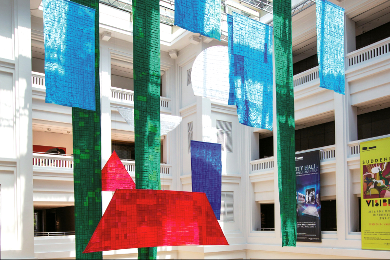 From Haifa’s mural, one can look out at the Singapore Courtyard of NGS and spot Port Dickson-based artist Chin’s colourful banners. Commissioned for the biennale, she invited the Singaporean public to come and help sew the pieces for her large-scale fabric installation, which are taken from flags of Malaysia’s political parties. Negotiating what is seen and unseen, the invisible threads nevertheless reveal the actions and efforts of those who worked to put it together, ultimately creating a monument of commemoration from the mundane. As for the title, the Muay Thai practitioner says the phrase “being solid in our own skin” is used in martial arts when one is truly strong. So, are we still wearing the skin of a tiger? Or have we truly become one? How do we get there?