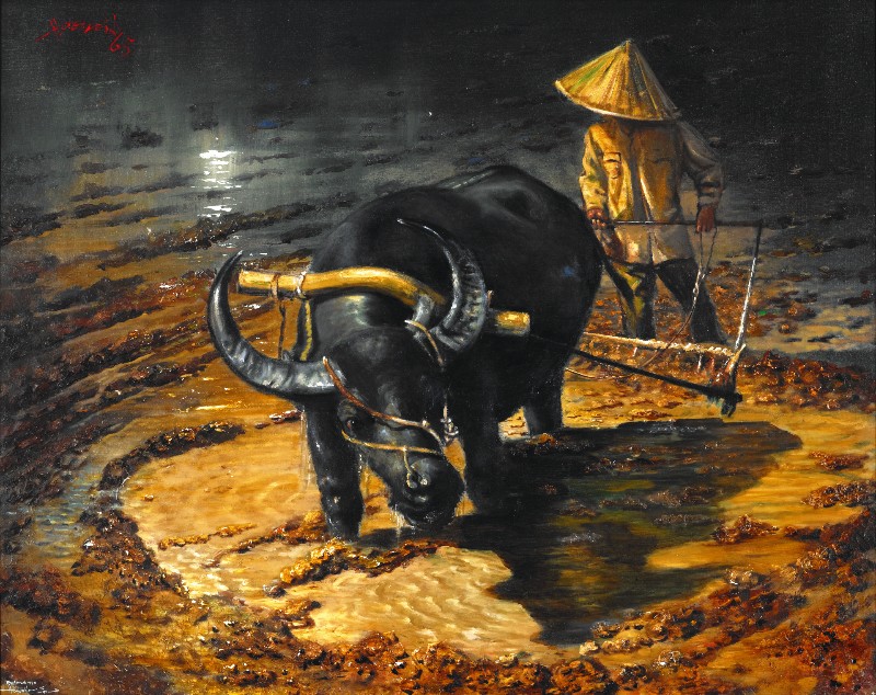 Hoessein Enas’ Kerbau resonates with his parents because it reminds them of the old days when Malaya had a deep agricultural history. Their generation valued hard work and it was honourable to toil on soil and to be seen doing it. The oil painting represents the whole concept of rezeki and feeding the family, Azmir explains.