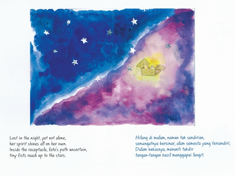 Malaysian visual artist and lawyer Ranerrim, who lives in London, captures the foundlings’ journey with colourful, uplifting illustrations that complement the text. Instead of dwelling on the dark side of fate’s uncertain path, they look to the stars for light to forge ahead.