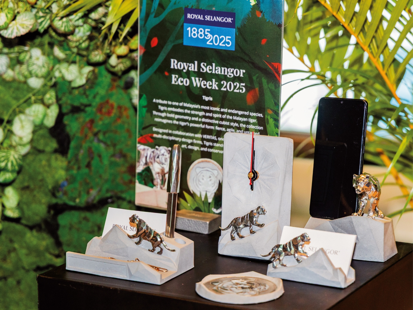 In 2022, his construction firm reached out to Royal Selangor for support, resulting in a collaborative deskware collection dubbed Tigris. The striped monarch of the Malaysian jungle inspired the miniature models that sport sharp, geometric lines atop concrete bases. Part of the sale proceeds for this collection go to Rimau, whose operating costs are steep. To outfit a ranger with proper equipment including trap cameras and rugged phones, the organisation has to fork out RM2,145.