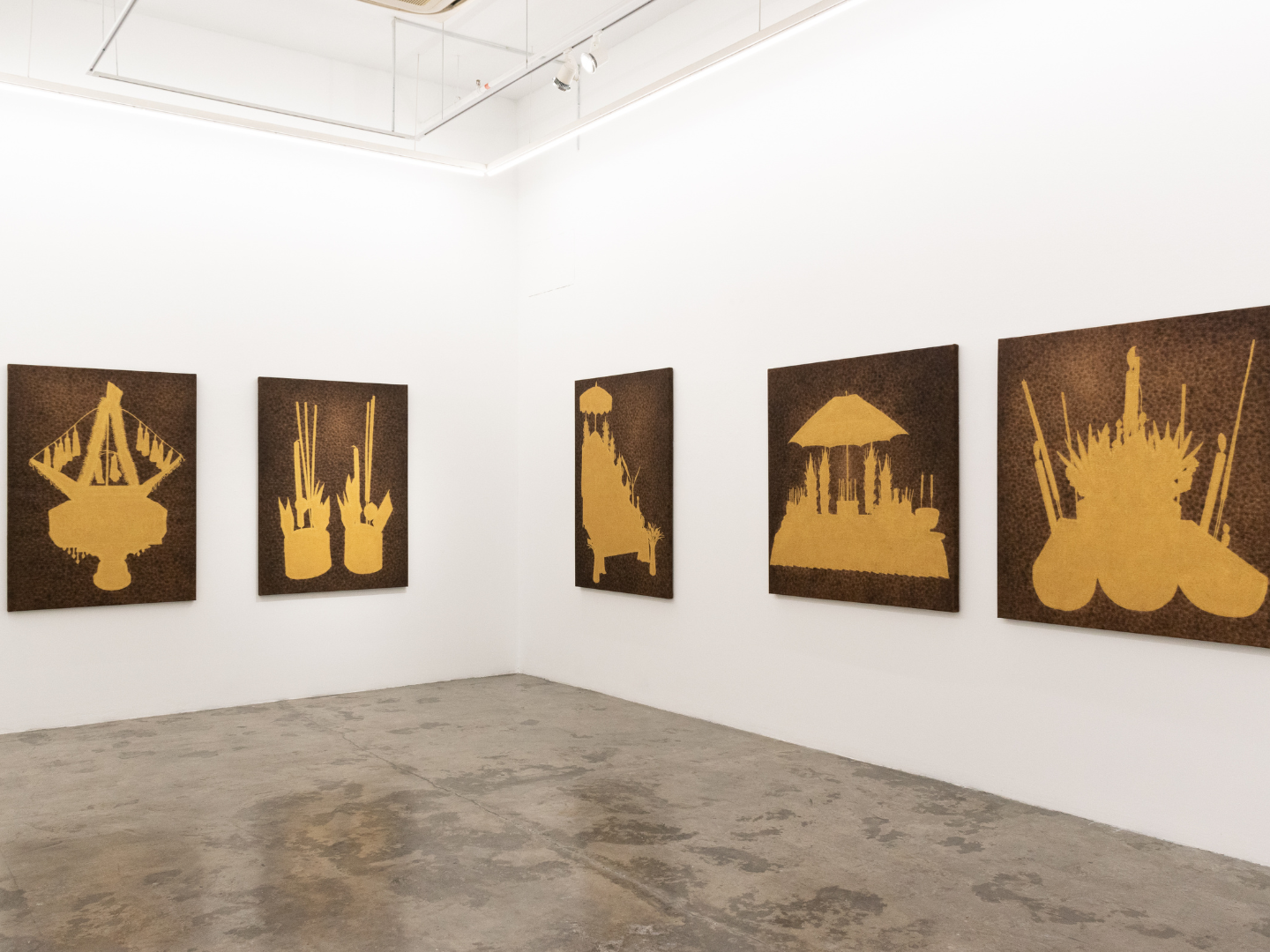 “In these works,” he tells Andrea Fam, curator of The World as Ritual, “objects of belief appear to float on darkened canvases in shades of light and dark gold. Through this use of colour, the exact form and precise lines become difficult to discern. Instead, the works demand focus, concentration and careful examination.