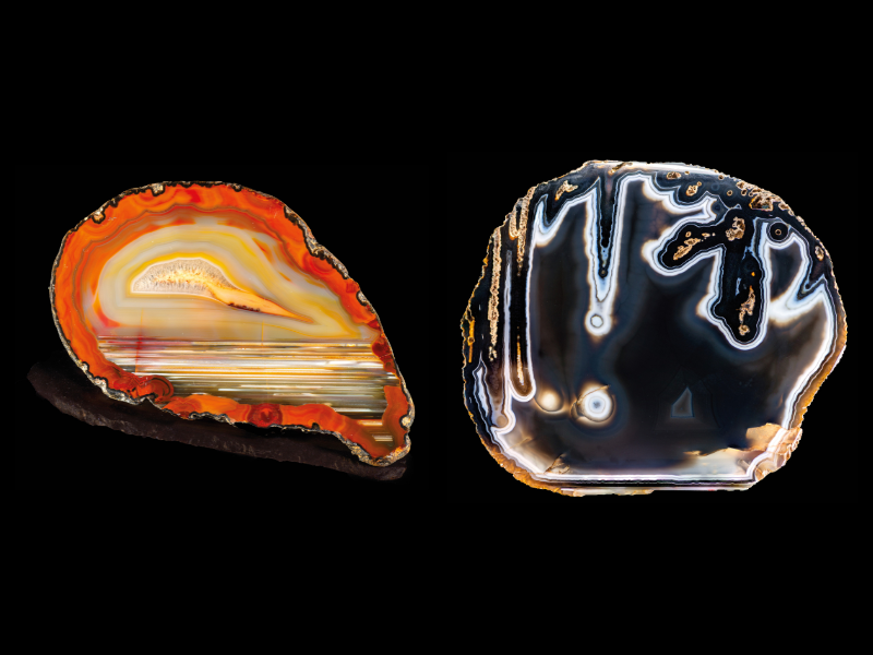 On a slab of peachy quartz, two circular impressions of eye agate give the stone a cheeky ogle, while an icy glacier floating in a pool of deep blue waters appears on a slice of agate with a contrasting quartz core. Streaks of calligraphy ink seem to drip down the face of a Brazilian onyx. A hunk of Italian limestone called a “ruin marble” resembles wooden engravings. In yet another agate, a monstrous mushroom cloud from a nuclear explosion looms over an ocean, spreading into the fiery sky.