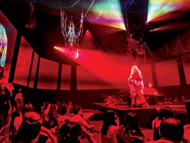 Lavish, full of everything, The Sea and The Neighbourhood contrasted considerably with the dark, stark, minimalist humming of Umbilical — a multidisciplinary work by artists Zul Mahmod, Rizman Putra, thesupersystem and Aiman Sunor Collective. Commemorating Singapore’s separation from mainland Malaysia, Umbilical featured a single, struggling figure on a platform, getting in and out of various garb, at one point resembling a tortured embryo. References to Kafka’s Metamorphosis, as noted by a fellow journalist, might have been obvious to some. To others, notions of a separate, even disparate, community — memories of that defining episode in the Singapore-Malaysia collective memory was palpable.