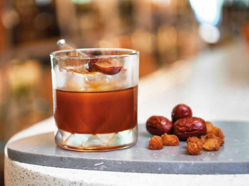 Red dates are mandatory eating this time of year if one is wishing for happiness and prosperity. Formulated à la Old Fashioned, Lucky Date is a refined take on the essential longan red date drink enjoyed by all ages. This recipe requires by far the most preparation, involving an infusion and cooked sugar, but rest assured it is well worth it. The warm toasted aromas, familiar yet elevated liang sui (cooling herbal tea) flavour and exquisitely smooth finish are guaranteed to impress.