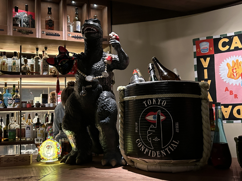 When the lift opens to the ninth floor that Tokyo Confidential calls home, the warm illumination, rich wooden interiors and grand view of the city skyline might initially suggest a seriously sophisticated vibe, but one look at the glittering disco ball, funky trinkets, vibrant vintage artwork and custom-made Godzilla keg (fully functional but a massive pain to clean, Graham shares) more than tips off the playful, silly spirit that pulses through the space. This lighthearted locale, where shots and champagne towers go hand in hand, invites guests to imbibe in elegance, yet not turn away from the chaos of a good party.
