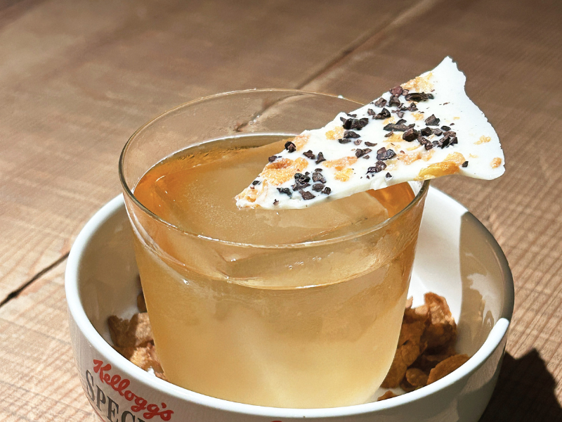 If you fancy something on the fun side, we would highly recommend springing for the aptly named Sore wa Subarashi (¥2,400), the translation of which some might recognise as the Frosties cereal slogan. Embodied by a familiar tiger-like feline in a red neckerchief, this bevvy somehow manages to capture the nostalgic sensation of that flavourful, leftover puddle of dairy at the bottom of every breakfast bowl. Cognac washed with frosted cornflakes achieves the toffee-like opening hints, amped up with a toasty yet creamy touch of coconut and the clarifying milk wash. The cacao nib is a pleasant and brilliant addition, contributing a bit of decadence and the suggestion of bitterness to tame the whole composition. A crisp shard of white chocolate, cereal and cacao nib, when paired with this not-too-sweet drink, brings the missing elements of sugar and crunch to what was easily our favourite order of the night.