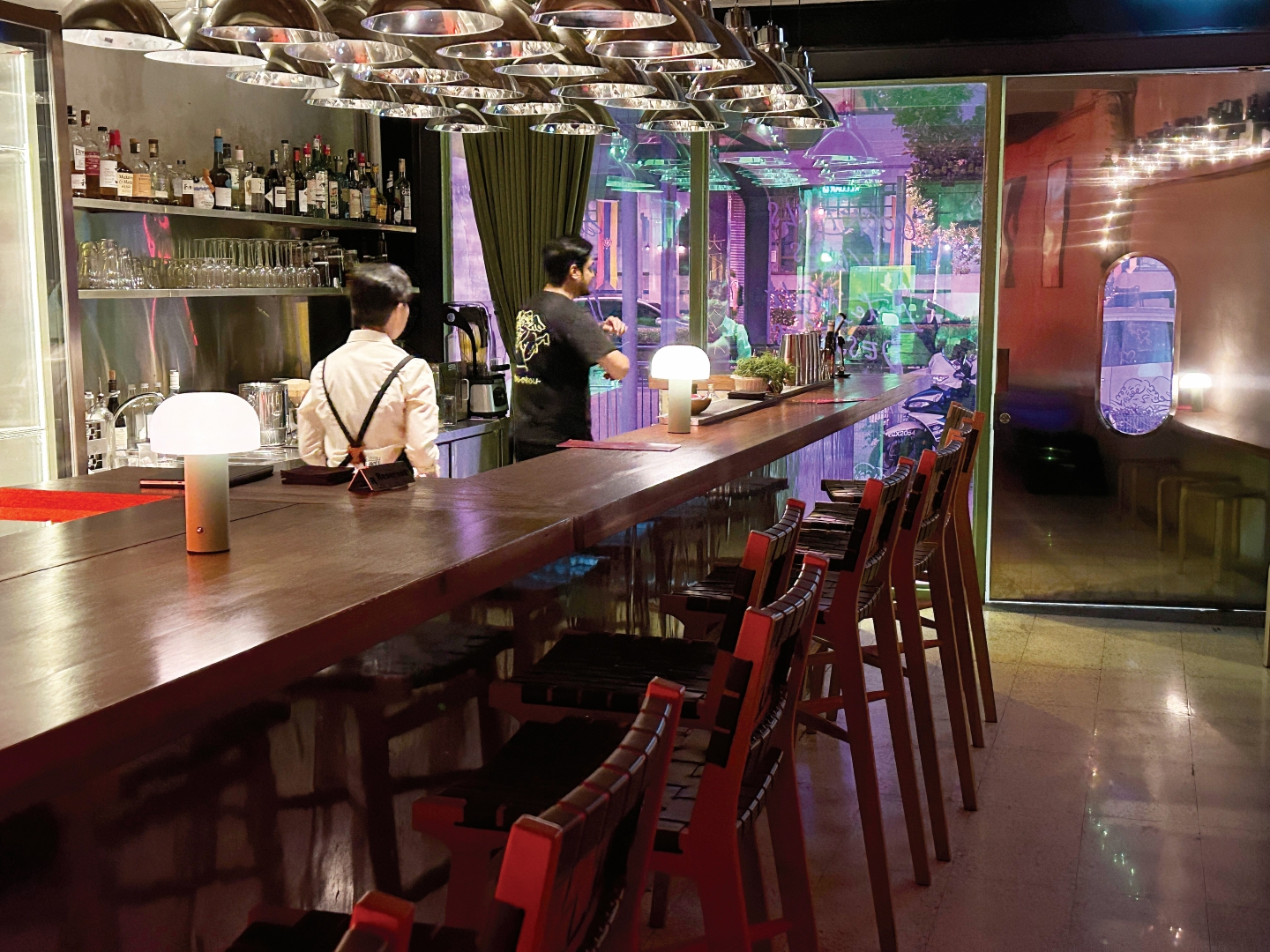 Chouchuo’s interiors juxtapose polished wood, chic steel features and a moody neon glow (All photos: Quincy Tan/ The Edge)