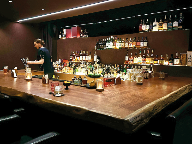 The interiors take a page from those of Nipponese whisky bars — suave, well-embellished yet restrained. An authoritative wooden countertop surrounded by about a dozen heavy leather seats makes a prime spot to sit, sip and relax while catching up with your mates.