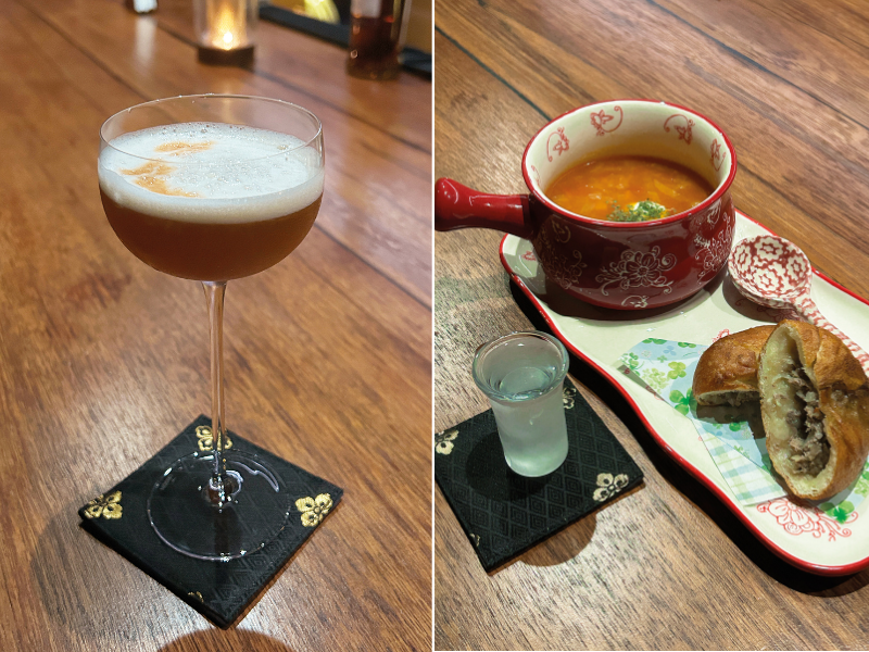 The recommended Cacao Club (RM75) appears to be a twist on the Clover Club, swapping out the gin base for whisky while retaining the red fruit component using Li Chu 64% raspberry chocolate and Ratafia Rossi cherry wine. Lemon and Musang King liqueur make up the last components, topped with a layer of sugar paper printed with a cacao bean. For all its ingredients, this liquid unfortunately missed the mark for us: the sweet and sour berry profile overwhelms, with only a mild milkiness towards the end to round it out, while the rest of its notes lose their place. The edible sheet does not really dissolve, leaving an awkward sensation of something drifting against your lips with every sip. Inoffensive but uncoordinated, it comes as somewhat of a letdown when Cacao’s prices poise it among the ranks of nearby heavyweights like Bar Trigona, yet its drinks do not quite have the bite to match its bark.