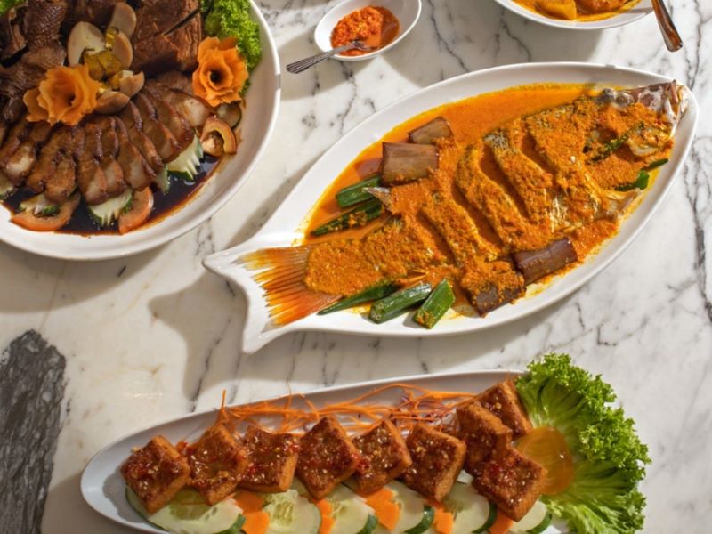 Come for the food but stay for the décor. Located along Heeren Street, Peranakan Mansion guarantees to delight both the eyes and the palate. This former traditional Melakan townhouse is where diners gather, seated around tables of varying sizes. The interiors are as Straits-influenced as can be, with lavish blackwood furniture, mother-of-pearl and marble detailing and carvings adorned with gold leaf. Begin with the classic starter of kueh pie tee before ordering dishes like babi cili garam, Nyonya chap chye and nangka masak lemak to communally enjoy with hot white rice.