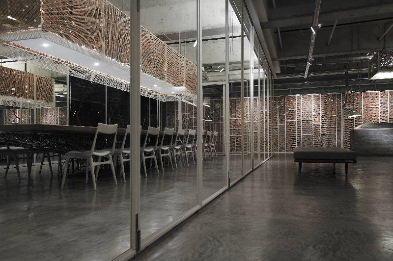 Custom-designed for the space, the table is made of cement, treated so it is soft to the touch and completed with wood panelling. Underneath, a complex network of wrought-iron rods — all recycled — holds the entire thing up. Hanging above it, specially designed metal cages temper the effect of lightbulbs in a most interesting way as they are filled with pieces of brick that were once used in Tujuan Gemilang’s old office. Similar structures are used to shield the private workspaces, located on the left and right of the central sales gallery, which sees a good number of visitors during the course of the day.