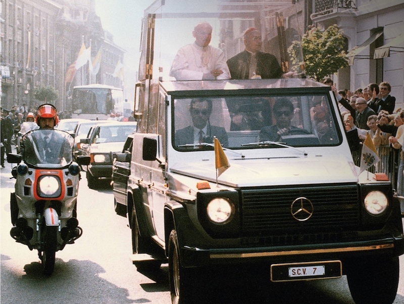 So desirable was this engineering marvel that, after the first commercially available model hit the autobahns, a request came from Pope John Paul II. The Holy Father asked for a special version of the four-door 230G with gilded trims, a floor panel raised by 40cm and a protected transparent dome made of bulletproof glass, so he could remain visible and close to the faithful during public appearances even in the most remote places. His Holiness, who from 1980 onwards used the G-Wagen as a papal transport vehicle or “Popemobile” for two decades, did not always wear a cape but he was certainly a crusader of style.