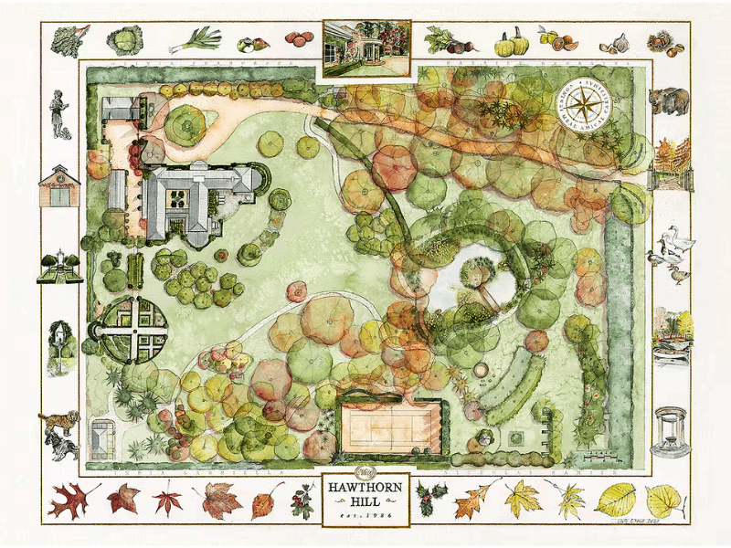 Though the couple sadly sold the property a few years ago — it was simply too large for them to manage, and they wished to dedicate more time to doting on the grandchildren — the land is memorialised on Pembroke’s website. A detailed account of the foliage, photographs sorted by season plus a gorgeous watercolour by artistic estate cartographer Catherine O’Neill are enough to make anyone wish they were strolling down the elegant Japanese bridge, inhaling the crisp air and munching on a freshly plucked persimmon.