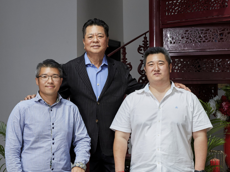 Pang flanked by his nephews Jason, who works with him on Bachang Villas, and Edmund, who runs Liu Men