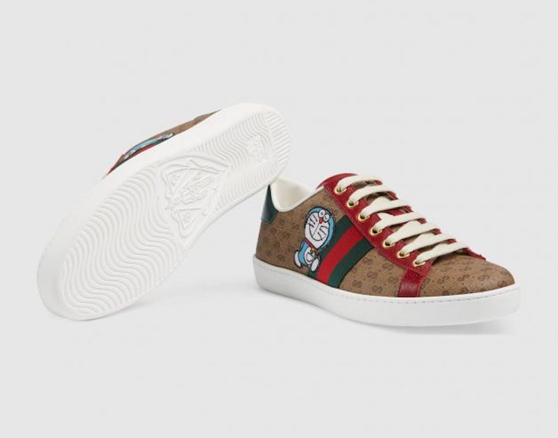 Japanese manga character Doraemon is seen prancing around Gucci’s Lunar New Year campaign and is featured across many product categories in the new collaborative collection. In terms of footwear, the cat robot makes an appearance on the Princetown slipper, displaying its many playful expressions on printed canvas with brown leather piping. A sauntering Doraemon patch is featured on the Ace sneakers (pictured) with green and cherry red leather trim. The Doraemon x Gucci collaboration also marks the manga’s 50th anniversary.