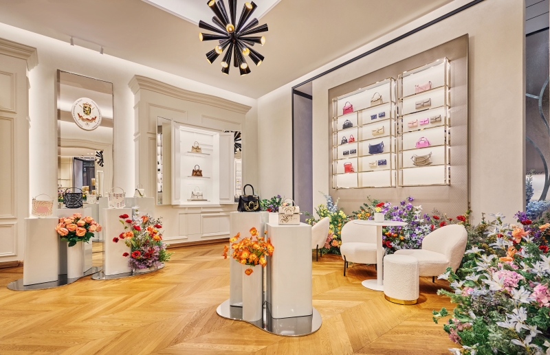 At the next display island, visitors encounter a trio of purses adorned with 3D sculpted blooms. An embossed tulip, plush to the touch, with a deep emerald stem wraps around the top handle of a Brillant Mini in tan calfskin. Of course, balance is what keeps nature running, and so a tone-on-tone black double perches nearby, the inky yin to its sibling’s sunnier yang. Another Pin accompanies the twins, this time taking on a powdery mint tone. A single iris stalk lolls across the front, an example of the house’s deft leather marquetry technique. (Tip: For the perfect Instagram post, look for the photo wall adorned with a larger-than-life version of this flower.)
