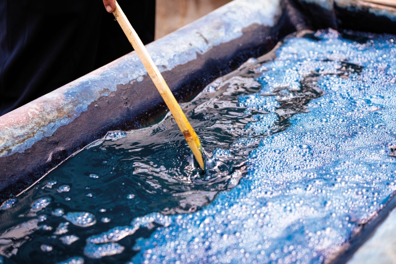 The freshly harvested leaves are placed into pots filled with water. After three days, the indicans are released and the mixture is aerated to form a concentrated paste. “However, in this form, you can imagine the blue dye as sleeping. Even though you mix it again with water and dip the fabric into it, it won’t stick. Next is what we call the reduction process — we have to wake it up.