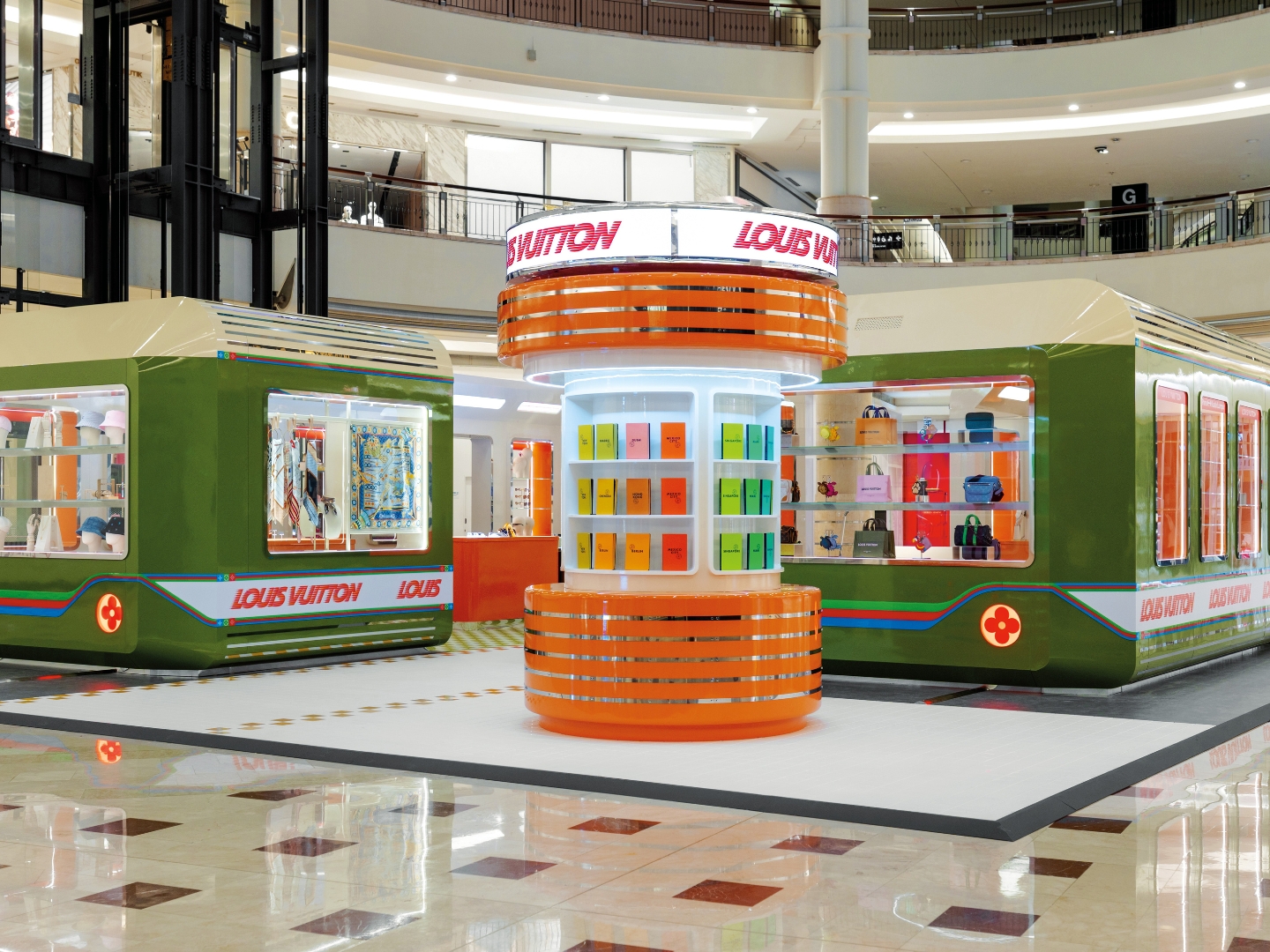 Stepping into the luminous space feels like boarding a first-class train, each “station” designed as a passage to discovery. The railway-inspired setting furnished in green and orange draws from the luxury house’s storied beginnings as a master trunkmaker and its enduring Spirit of Travel campaign, reimagined for a new generation.