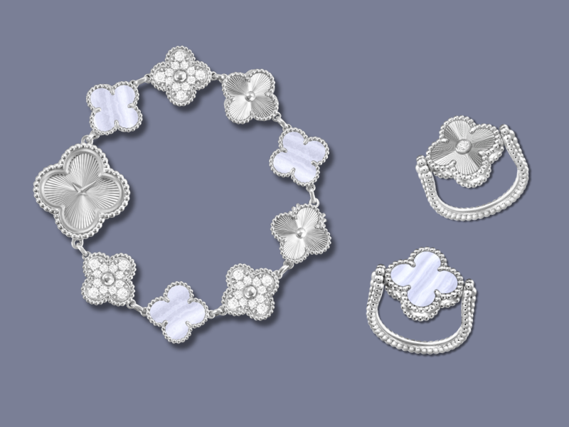 As usual, the brand’s finesse in selecting metals and ornamental stone combinations shines through. One version intermingles the warmth and gracefulness of rose gold with the cool edge of lustrous grey and white mother-of-pearl. The same milky, iridescent material makes a second appearance on the white gold variation, where it complements clovers cut from pale blue chalcedony. Instead of diamonds, light bounces off motifs with a guilloché pattern of thin radiating lines, illuminating the ensemble.