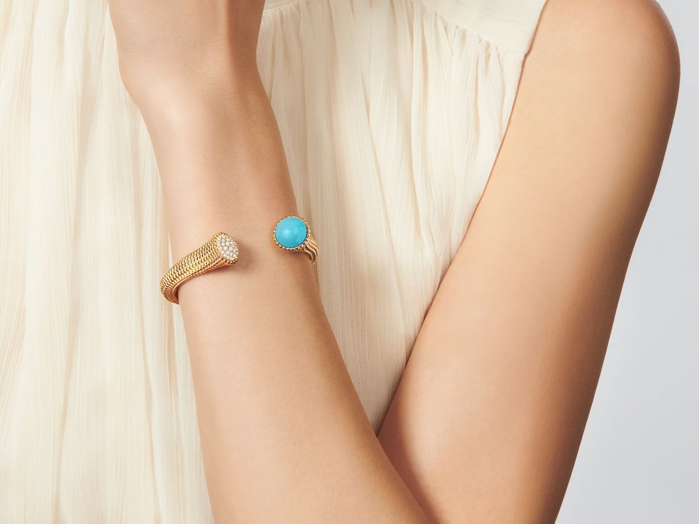 Fashioned from yellow gold, a necklace, bracelet and ring showcase turquoise cabochons as their focus stones, which have long enjoyed a reputation as one of the maison’s heritage materials. The bracelet and ring also come set with brilliant diamonds. Tiny beads outline the gems, accentuating the curves of the pieces.