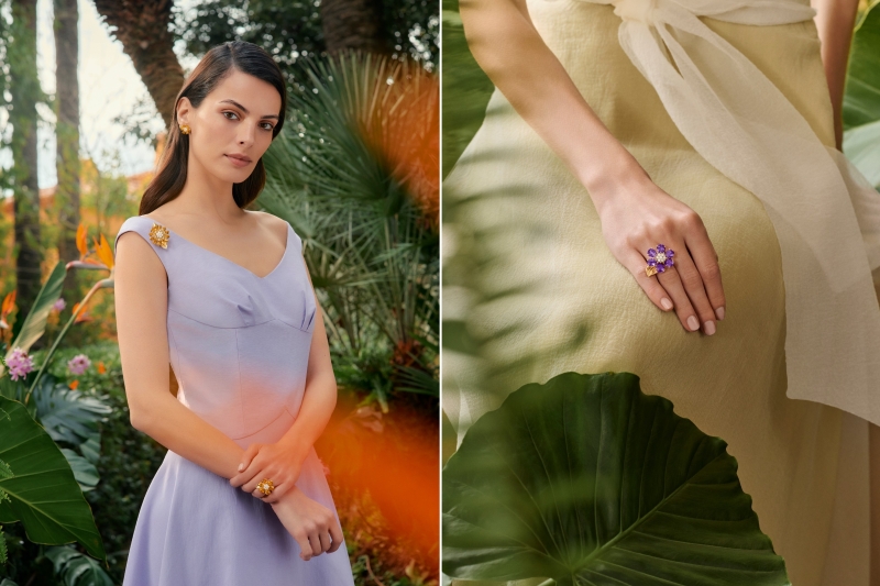 Coloured gems take centre stage in this stellar series, appearing in the lush petals of the flower motifs, detailed with diamond pistils and gold foliage. Five key colours appear across rings, earrings, pendants and wristwatches: joyous orange-yellow citrine, enchanting purple amethyst, sensual deep pink rhodolite, brilliant water-blue aquamarine and sprightly lime green peridot. Each of these precious stones is thoughtfully paired with rose, yellow or white gold to emphasise the vividness and intensity of its hue.