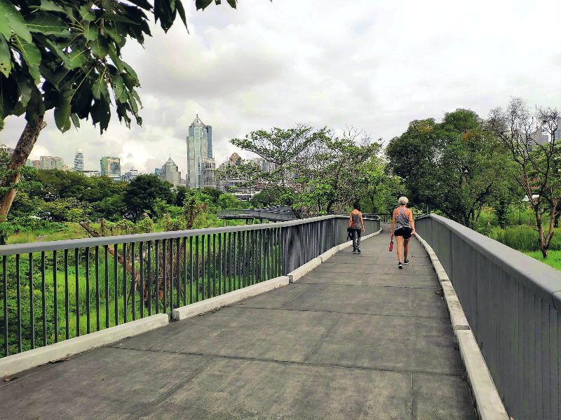 The skyway ends at the park’s boundary at the Green Bridge, an overhead pedestrian walkway that has been in existence since 1999. It is about 1.6km long and passes over traditional neighbourhoods as well as busy Bangkok roads.