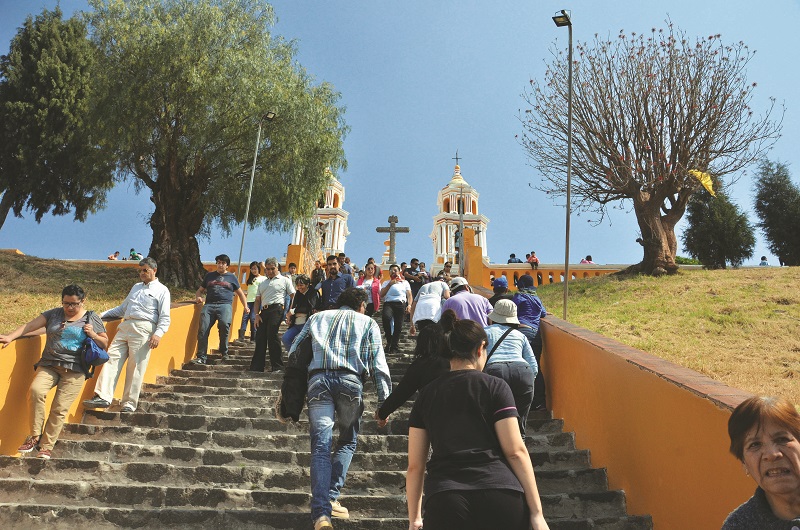 The church seems more like a tourist attraction than a place of worship. In the church compound, against the scenic backdrop of the surrounding country, with Cholula spread out like a map below, visitors crowd the railings to take selfies of themselves. There is a carnival atmosphere. Vendors in the shade of a big tree in the church compound offer huge tostadas to hungry patrons who have trudged up the hill.
