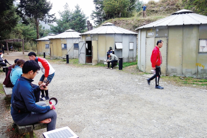 Jiu Jiu Huts was a large sprawl of wooden buildings, with metal yurts around the central kitchen and the dining area on a flat piece of land. The accommodation comprised of large common dormitories with raised double decker shared wooden platforms covered with spongy plastic mats. Down sleeping bags were provided. Toilets in a separate building can best be politely described as “basic.” The level of upkeep seemed rather out of character with the Taiwanese penchant for neatness and cleanliness.