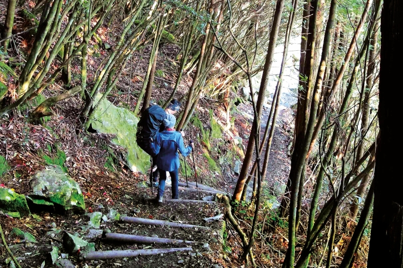 Every 100m, a wooden marker displayed the distance. It became steeper as we were ascending a one in four or average 25° incline. Steps cut into the slope at steep points helped. Around and above us spread the forest, a vast green canopy of filtered light, cathedral-like in majesty and silence. It was not as dense or humid as a tropical rainforest, yet that was small consolation as we laboured upward.