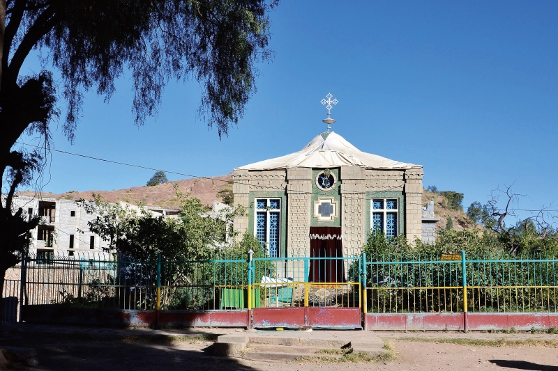 Within, the church was cool and dim, with thick walls and sturdy arches, a fresco of the Three Wise Men on a wall panel. Behind a thick curtain was a replica of the ark, the centrepiece of every Ethiopian church, held in the innermost sanctum, the Holy of Holies.