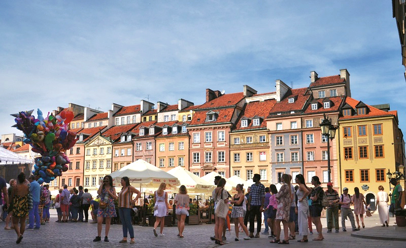 Sigismund’s Column, on which a statue of the king who made Warsaw the capital of Poland in 1596 is mounted, rises from the square. Pedestrian alleys lead away into the narrow, cobbled streets of Old Town, hemmed in by tall, narrow buildings on either side.