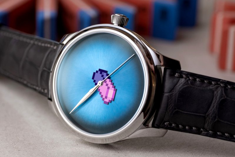 16. The watchmaker that sometimes eschews its name on dials is now erasing time on the wrist. In a collaboration with Parisian artist Romaric Andre, alias seconde/seconde/, H. Moser & Cie. swaps the hour hand with a pixelated eraser on the Funky Blue fumé dial in the Endeavour Centre Seconds Concept x seconde/seconde/. This 20-piece steel online-only edition comes with a framed artistic rendering of the watch and the missing hour hand.