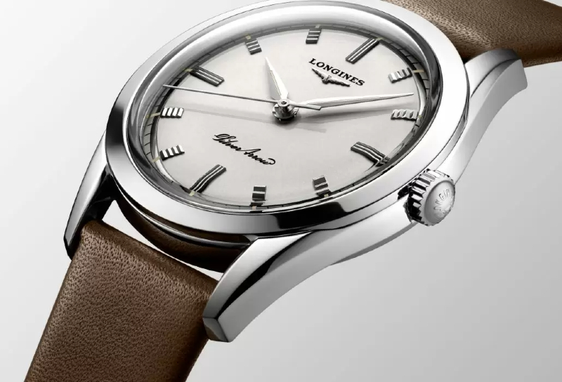 9. Turbocharging time is the vintage re-edition of the Silver Arrow, a Longines 1950s horological reference named after the era’s famous German sports car. Today’s 38.5mm steel version evokes the heritage of the original timepiece, from the silver opaline dial with striated indices and sword-shaped hands to the boxy sapphire glass and matte brown leather strap. Flip it over to check out the Silver Arrow emblem on the screw-down caseback.