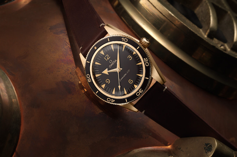 3. As a nod to its proud history in ocean exploration, bronze is uplifted in the new Seamaster 300. Omega crafts the 41mm model from bronze gold, a unique alloy of 37.5% gold, palladium and silver that boasts a soft pink hue and incomparable corrosion-resistance. Its slow patina over time will complement the bronze alloy (CuSn8) dial and brown ceramic bezel ring with diving scale outlined in vintage Super-LumiNova.
