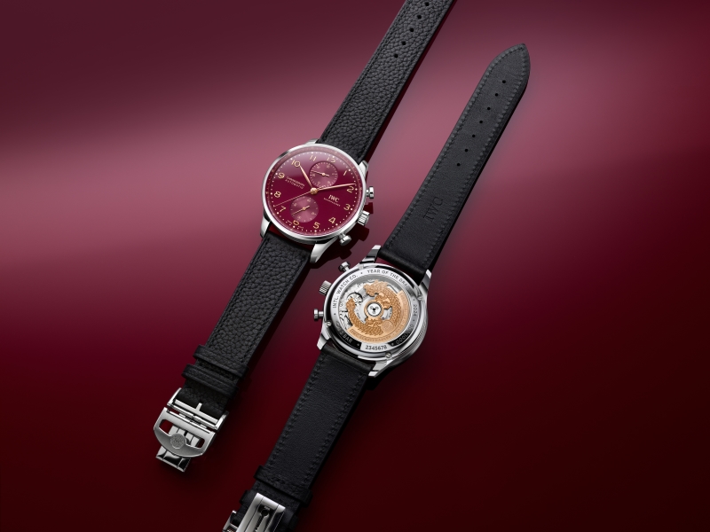 The coveted Portugieser Chronograph by IWC Schaffhausen is now available in a deep burgundy hue for Chinese New Year. Paired with a 41mm stainless steel case and gold-plated hands and appliques, the Portugieser Chronograph Year of the Dragon is perfect for those seeking a more timeless but no less stylish design. The gold-plated rotor, which can be seen through the transparent sapphire caseback, takes the form of a majestic dragon. Here, a “2024 Year of the Dragon” engraving also marks the timepiece. Limited to 1,000 units, the watch comes with a black calfskin and burgundy rubber strap, allowing the wearer to choose between two distinctive looks. (RM39,500)