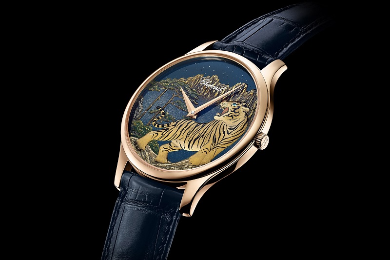 It all started during the Year of the Snake in 2013, when Chopard celebrated Chinese New Year with timepieces dedicated to the zodiac animal. As always, each creation is decorated with ancestral technique of urushi lacquer, a transformative material prized for its infinite versatility spread across all facets of Asian culture. Parked under Chopard’s Métiers d’Art section, the roaring tiger this year stands out against a rich background on the dial handcrafted using urushi lacquer base. To bring the creature to life, the details are accentuated with a sprinkling of gold dust. Master lacquer artist Minori Koizumi of the century-old Yamada Heiando Imperial lacquerware workshops has been put in charge to decorate all 88 dials of the watch.