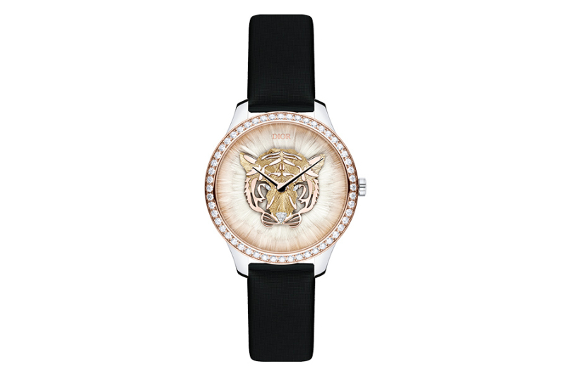 In an elegant representation of the animal that graces the upcoming Lunar Year, Dior unites the maison’s refined expression of creativity and sense of colour with classic watchmaking features such as oscillating weights, bezels, calibers and dials. A 36mm case is accentuated with a dial decorated with white and gold-tone feathers, set with trillion-cut and marquise-cut diamonds; while hour and minute hands come in pink gold for a swipe of colour. At the back, the sapphire crystal is adorned with a tiger pattern, revealing its automatic movement. Limited to 88 pieces only.