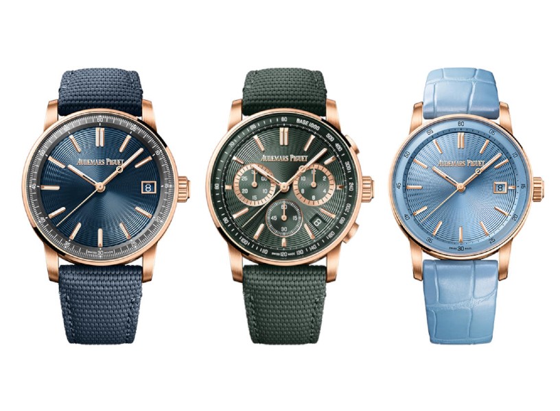 The pastel-coloured ‘Grande Tapisserie’ dials and matching pearly alligator straps add a sophisticated touch to the 37mm Royal Oak Selfwinding in 18-carat pink or white gold (All photos: Audemars Piguet)