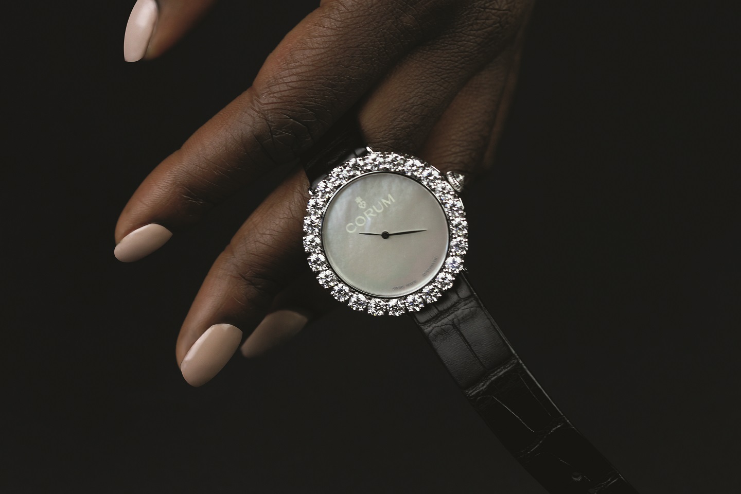 Available in white or pink gold, Corum’s resolutely feminine Heritage Sublissima timepiece shimmers with a corolla of diamonds around the bezel. Its graceful, refined appearance is enhanced by a mother-of-pearl dial housed in a 38mm diameter case. Paired with black alligator-skin strap with a gold pin buckle and powered by a mechanical movement with 50-hour power reserve, the watch exudes intrigue and sensuality. Issued in a limited edition of eight pieces in rose gold and 18 in white gold, the timepiece is perfect for the woman who gravitates to an elegant and delicate vision of modernity.